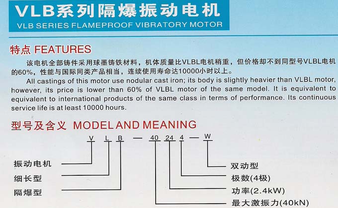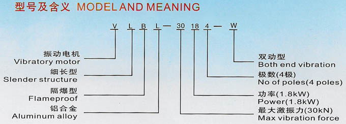 VLB、VLBL系列户外隔爆振动电机设计成细长结构,激振力作用点距离(地脚孔的距离)特宽,尤其适用于宽距离处传递激振力的场合,广泛用作石油行业泥浆分离筛激振源。泥浆分离筛装配此类振动电机,运行更平稳,构件受力更均匀,有效延长其使用寿命。VLBL系列是在VLB系列基础上结合油田的使用状况,新研发的一种铝合金壳体的新型振动电机。其结构合理、质量轻,参振质量与同类产品相比大幅度降低。VLB、VLBL系列产品可单独使用,亦可组合使用。其防爆性能符合GB3836.2-2000《爆炸性气体环境用电气设备第二部分:隔爆型“d”》的规定,防爆标志为dIIBT4,适用于 II类A、B级T4组别可燃性气体或蒸汽与空气形成的爆炸性混合物的场所。